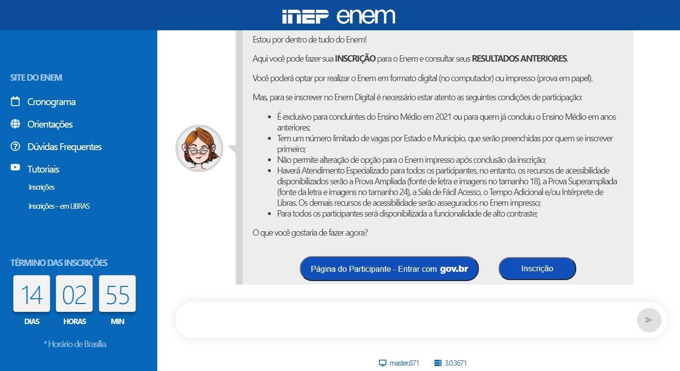 Desde 2020, o participante pode escolher entre fazer o exame impresso ou o enem digital, com provas aplicadas em computadores, em locais de prova definidos pelo inep. O calendário oficial do enem 2021 ainda não foi divulgado pelo inep. Para não isentos, o pagamento da taxa de r$ 85 pode ser realizado até o dia. Porém, com base em edições anteriores das provas do enem, conseguimos fazer algumas previsões de quando cada etapa poderá acontecer, já supondo os dias do enem seriado. Como fazer a inscrição no enem Fique por dentro e veja como utilizar a sua nota para ganhar bolsas de estudo! Enem 2021 tem datas para o período de inscrição definidas estudantes terão entre os dias 28 de junho e 9 de julho para fazer a inscrição; Confira datas de inscrição e provas. A taxa é de r$ 85. As versões impressa e digital serão aplicadas nas mesmas datas. Solicitação de 30 de junho a 14 de julho; As inscrições para o enem 2021 acontecem entre os dias 30 de junho e 14 de julho. O interessado deve fazer a sua inscrição e pagar uma taxa para confirmar.
